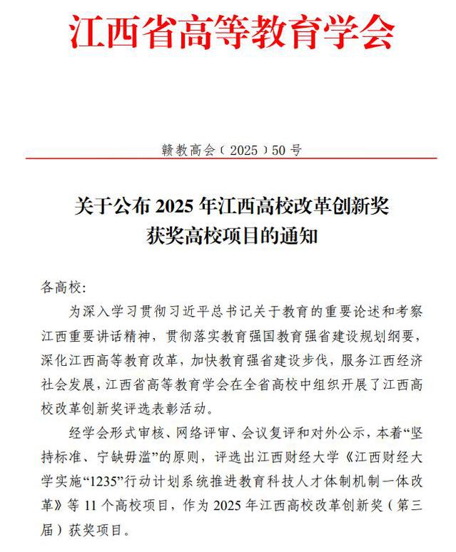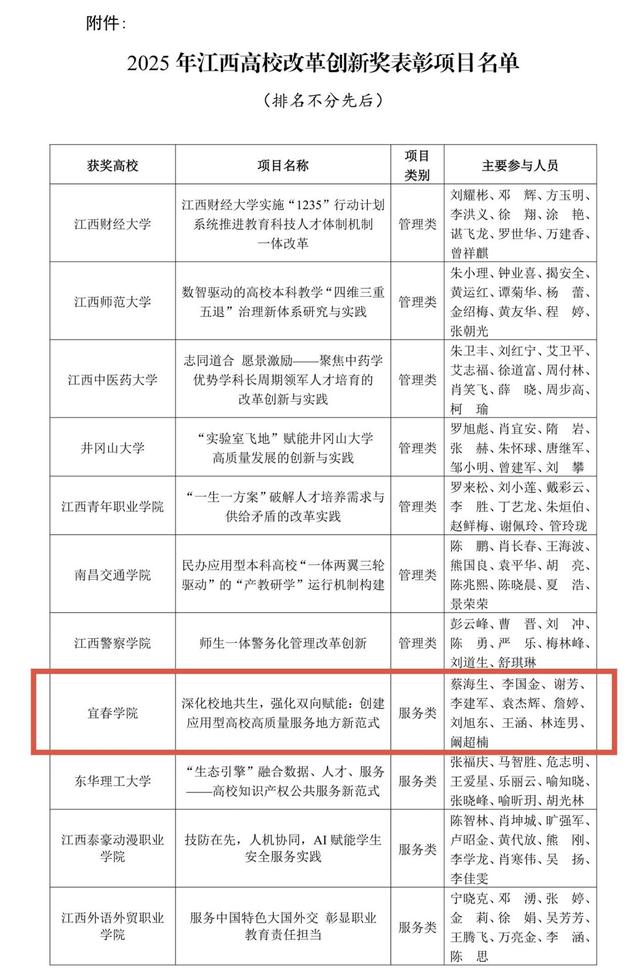 本站讯(科学研究处 供稿)近日,江西省高等教育学会正式公布了2025年江西高校改革创新奖获奖名单,beat365官网申报的“深化校地共生,强化双向赋能:创建应用型高校高质量服务地方新范式”项目脱颖而出,成为本届获此殊荣的4个服务类项目之一。