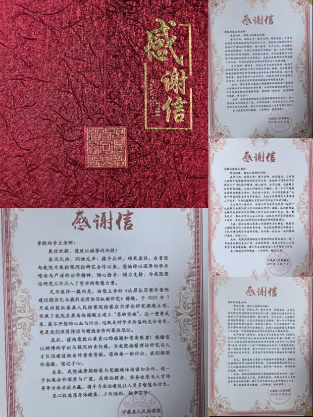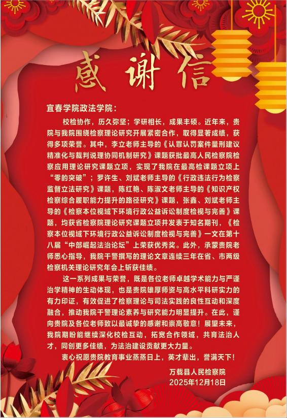座谈会上,万载县人民检察院领导代表检察机关,向政法学院及多位作出突出贡献的教师送上了饱含敬意的感谢信。信中高度肯定了双方近年来在检察理论研究领域的紧密合作成果:李立老师主导的课题实现了万载县人民检察院在最高人民检察院课题立项上“零的突破”,罗许生、陈红艳、陈淑文、刘斌、张鑫等老师牵头的多项课题获省人民检察院理论研究课题立项并发表于知名期刊,相关成果还在“中部崛起法制论坛”斩获殊荣;同时,在政法学院教师的悉心指导下,人民检察院干警撰写的理论文章连续三年在省、市两级理论研究年会上屡获佳绩。这些成果不仅彰显了政法学院教师的卓越学术能力与严谨治学精神,也印证了学院雄厚的师资力量与高水平科研实力,更推动了检察理论与司法实践的深度融合,有效提升了检察干警的理论素养与研究能力。