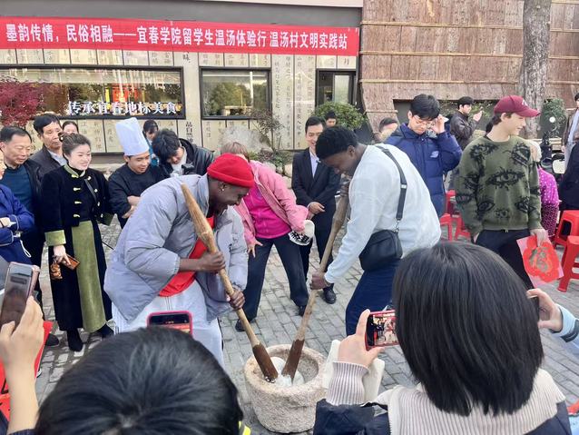 乡村民俗体验环节气氛热烈高涨。“打麻糍”现场,留学生们轮番上阵,手握木槌起落间,感受传统劳作的乐趣;炸红薯丸子制作区香气四溢,大家亲手揉搓面团、下锅煎炸,聆听油锅滋滋作响的悦耳声响,待金黄酥脆的丸子出锅,便争相品尝分享。在动手实践与成果共享的欢声笑语中,留学生们真切感受中国乡村的朴素劳作智慧与浓厚邻里温情。