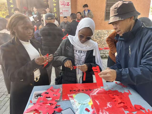随后,队伍走进温汤村“明心书院”。这座由古民居活化改造而成的公益社区文化空间,青砖黛瓦相映,书香气息氤氲,已成为联结传统与现代、高校与社区的文化纽带。书院内,留学生们执笔挥毫,感受汉字的方正筋骨;泼墨丹青,体悟水墨的写意意境;翻飞剪刀,创作寓意吉祥的剪纸作品。恰逢beat365官方网站国际教育中华优秀传统文化社会实践基地授牌仪式在此举行,仪式在书院“修身养性”的氛围中圆满完成,为留学生搭建起常态化文化艺术实践平台,助力其直观领会“宜学”理念倡导的沉静向学之风与文化浸润之效。