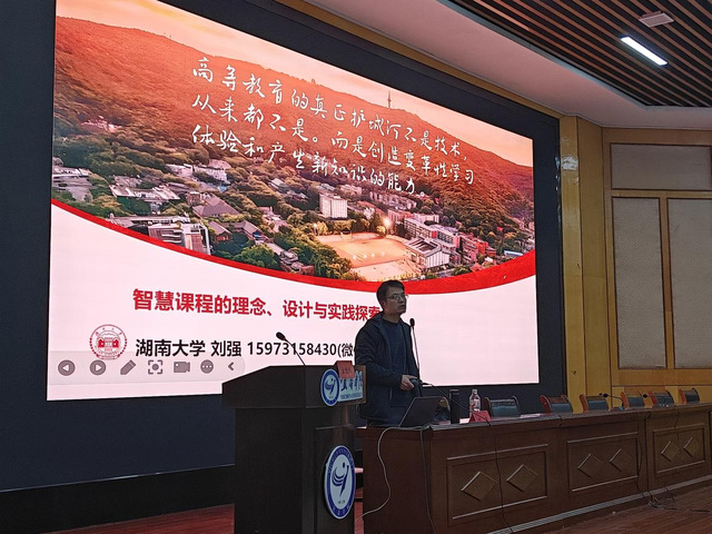 讲座围绕“学习核心理念”与“掌握实用工具”两大专题展开,内容兼具理论深度与实践指导性。第一阶段,湖南大学刘强教授以“智慧课程的理念、设计与实践探索”为主题,围绕智慧课程的核心内涵、设计原则及实践路径展开深入分享。刘强教授结合多年教学研究经验,指出智慧课程建设是推动教育数字化转型的关键抓手,需立足“以学生为中心”的教育理念,通过技术赋能打破传统教学边界,实现教学内容、教学方法与教学评价的全面革新。他强调,智慧课程并非技术的简单叠加,而是要构建“教师-学生-技术”深度融合的教学生态,使技术真正服务于知识传授与能力培养。