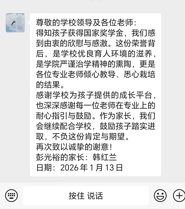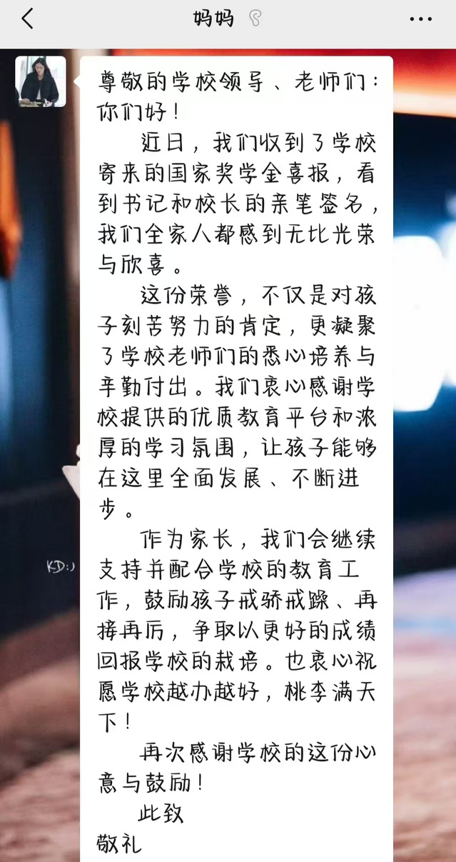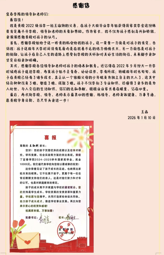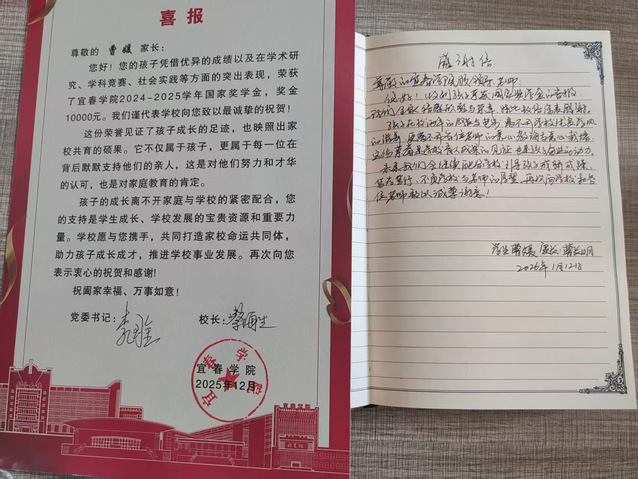 本站讯(学工处 供稿)近日,beat365官网向荣获2024-2025学年国家奖学金的学生家长寄送了专属喜报,将学生在校的优异表现传递至家庭,以实际行动深化家校协同育人,共同见证学生的成长与荣誉。