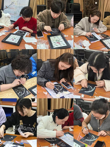 在螺钿画制作环节,女教职工们兴致盎然,充分发挥创意与想象力,在一粘一贴间精心雕琢,将平凡的材料打造成一件件独具匠心的螺钿画作品。现场欢声笑语不断,大家一边创作,一边交流生活与工作点滴,在指尖的创作中不仅舒缓了工作压力,还感受到这项传统非遗技艺的别样魅力。活动最后,女教职工们手捧自己的作品移步展示区,集中展示创作成果并合影留念,定格这份独属于三八妇女节的美好记忆。
