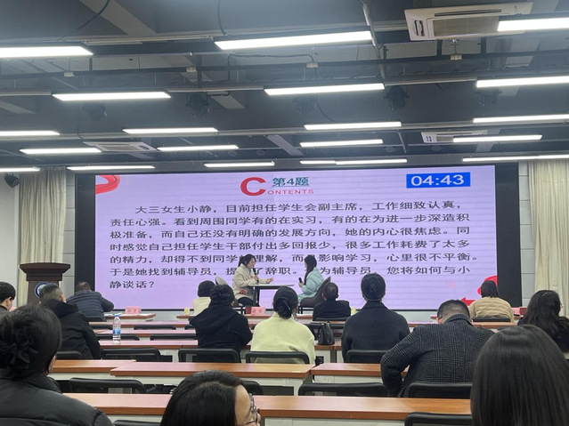 本次大赛自2026年1月启动以来,严格对标国赛、省赛核心环节,紧扣一线学生工作实际,突出实战化、专业化导向,设置基础知识测试、学情分析、案例研讨、谈心谈话四大环节,全方位检验辅导员的理论功底、业务能力与育人实效。