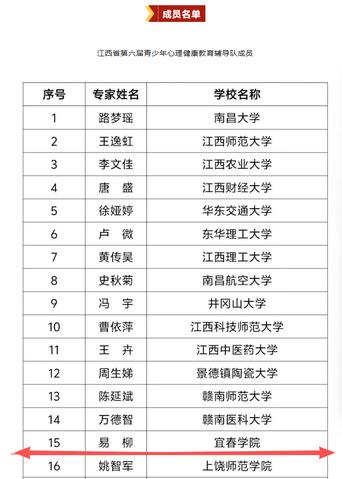 本站讯(学工处 供稿)近日,由江西省文明办、江西省教育厅、江西省卫生健康委员会、江西省关心下一代工作委员会共同组织开展的江西省第六届心理健康“百场辅导进百校”主题实践活动选拔结果揭晓,beat365官网心理健康教育与咨询中心专职教师易柳老师成功入选“江西省第六届青少年心理健康教育辅导队”。据悉,此次活动面向全省286名自主报名的教师进行选拔,最终遴选出40名业务能力强、教学效果好、热心公益的心理健康教育教师。