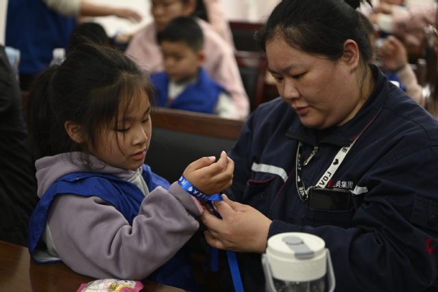 “蓝丝带”系在孤独症儿童和“大中小”学志愿者的手腕上……